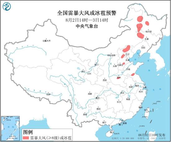 预计8月2日14时至3日14时,内蒙古东北部、黑龙江西部、吉林西部、河北北部及中南部、北京西南部、河南中部、山东南部、安徽北部等地局地将有8-10级雷暴大风或冰雹天气;内蒙古东部、黑龙江西部、吉林西部、辽宁南部、河北东北部及中南部、京津地区、山东东部及南部、安徽北部、河南中部、湖北西北部、四川中南部、贵州西南部、广西西南部和东部、广东中西部和沿海等地的部分地区将有短时强降水天气,小时雨强30-50毫米,局地可达70毫米以上。