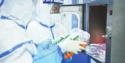 工作人员将核酸检测样本通过传递窗传递,避免实验室内部的气体互通。记者金振强 摄