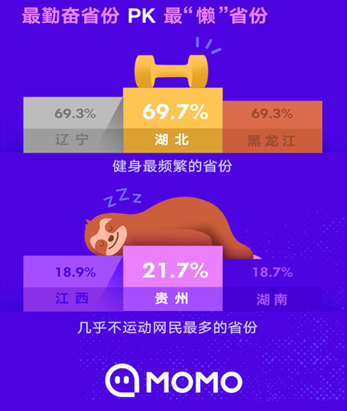 从地域来看,全国健身热情最高涨的十个省市为湖北、辽宁、黑龙江、河北、陕西、云南、上海、江苏、重庆和四川,每周健身超3次的网民比例分别为69.7%、69.3%、67.8%、67.3%、67.2%、65.4%、64.2%、63.6%、61.5%和61.5%。健身最不积极的省市则为贵州、江西、湖南、北京、安徽、黑龙江、广西、四川、河北、内蒙古,几乎不运动的网民比例居全国前十,分别为21.7%、18.9%、18.7%、16.0%、15.3%、15.3%、15.1%、14.1%、14.0%、13.6%。