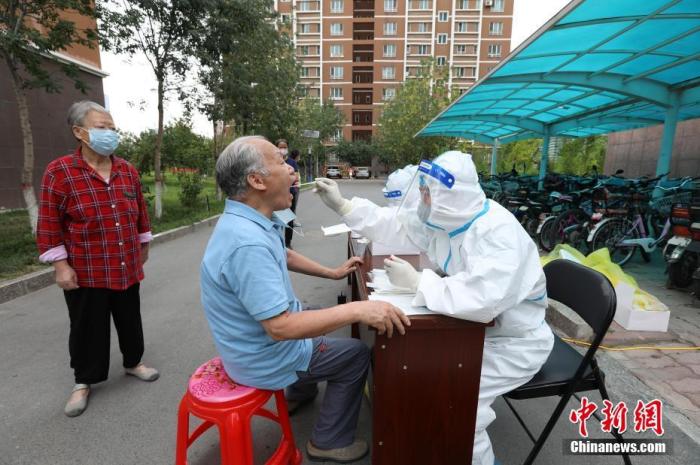 8月1日,新疆兵团第五师双河市师部城区楚星绿城二号楼,全体居民正在楼下采样点依次进行核酸检测。图片来源:人民视觉