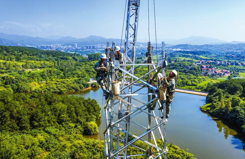 随州日报讯(全媒记者 李文军 通讯员 谌秦岭 )目前正值迎峰度夏时期,国网随州供电公司每天组织近百名工人奋战在高温建设一线抢抓电网建设。图为8月5日,110千伏滨湖至涢水线路曾都区前进社区段高架线上,3名电力工人正冒着高温安装间隔棒。该工程从今年7月开始进入放线阶段,计划在9月中旬投产送电,工程完工后,随州高新区、碧桂园片区和城南新区能够形成电力环网,将大力提升随州主城区及周边企业、居民用电可靠性。