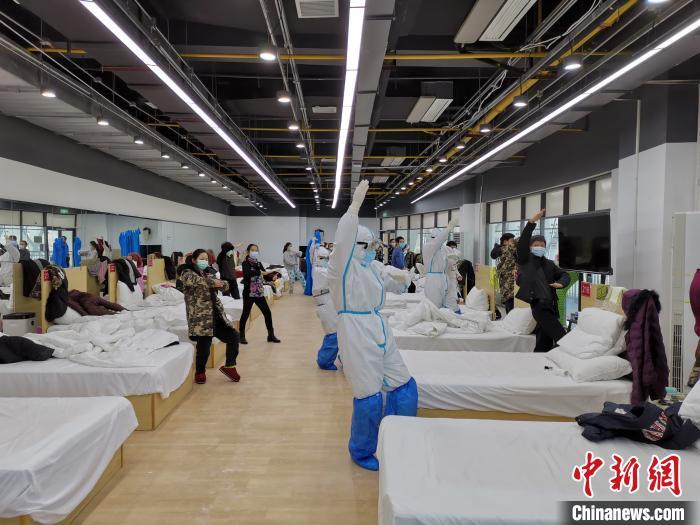 资料图:在武汉大花山方舱医院,医护人员带领一批患者积极“解锁”太极拳技能。后面,医护工作者还将视情教授五禽戏、八段锦。 张明 摄