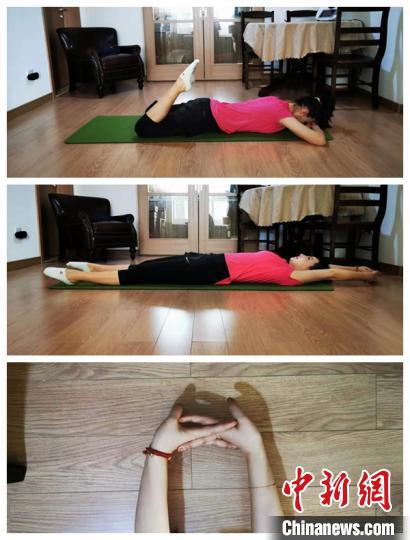 天津体院专家提供居家健身方案。图为由谭思洁教授创作的自身抗阻与拉伸练习。(动作示范者为艺术体操国家级裁判崔荔) 曹立全 摄