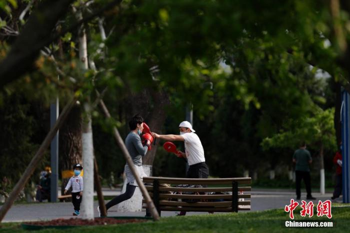 资料图:4月26日,拳击健身教练伊力夏提(右)带领学员在北京龙潭公园内练拳。新冠肺炎疫情发生后,伊力夏提所在的健身俱乐部暂时停业,他带领学员在公园坚持锻炼。中新社记者 富田 摄