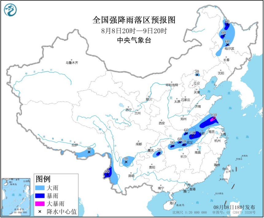 中新网8月18日电 据中央气象台网站消息,中央气象台8日18时继续发布暴雨蓝色预警:预计,8日20时至9日20时,黑龙江中西部、吉林西部、江苏中北部、安徽中北部、河南东南部、湖北东部和南部、湖南北部、贵州北部、四川南部、云南西部、西藏东南部等地的部分地区有大到暴雨,其中,江苏中北部、湖北东北部局地有大暴雨(100~130毫米)。上述部分地区伴有短时强降水(最大小时降雨量30~50毫米,局地可超过70毫米),局地有雷暴大风等强对流天气。