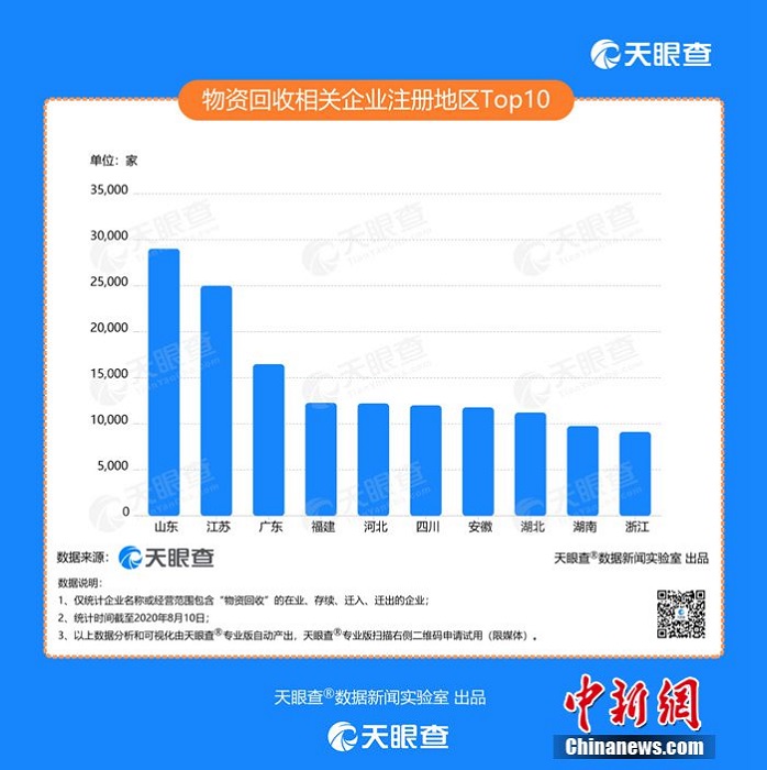 近十年来,我国物资回收相关企业(全部企业状态)的增速和增量均呈稳定上升趋势。2019年我国新增物资回收相关企业超过4.5万家,增速达15.63%,为历史新增最多的年份。截至8月10日,天眼查专业版数据显示,以工商登记为准,我国今年前7月共新增超过2.15万家物资回收相关企业,山东省新增的企业数量最多。