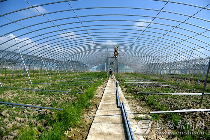 8月10日,工人正在来凤凤栖生态产业园大棚施工。