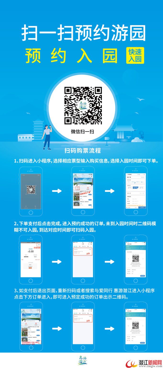 1.扫码购票。只需扫描“惠游潜江”二维码进入“惠游潜江预约平台”小程序,选择相应票型,输入购买信息,选择入园时间即可下单。