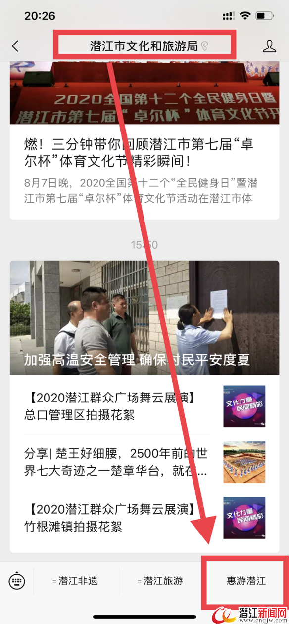 2.进入市文化和旅游局微信公众号,点击“惠游潜江”进入平台预约。