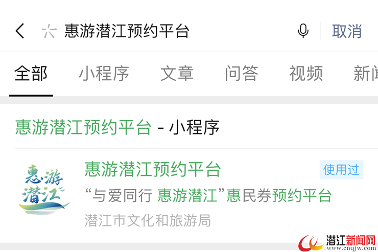 3.搜索“惠游潜江预约平台”微信小程序,进入平台预约。