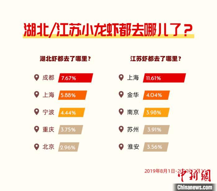 如果将湖北与江苏两省的小龙虾做比较,湖北小龙虾主要消费城市为成都、上海、宁波、重庆、北京,覆盖中国东部、中部、西部等地区;江苏小龙虾主要出现在上海、金华、南京、苏州、淮安等城市的餐桌上,这与两省地里位置有较大关系。值得一提的是上海人民不愧为“老饕”,既爱享受湖北虾的肥美,又钟情于江苏虾的鲜香,堪称食客中的“海王”。