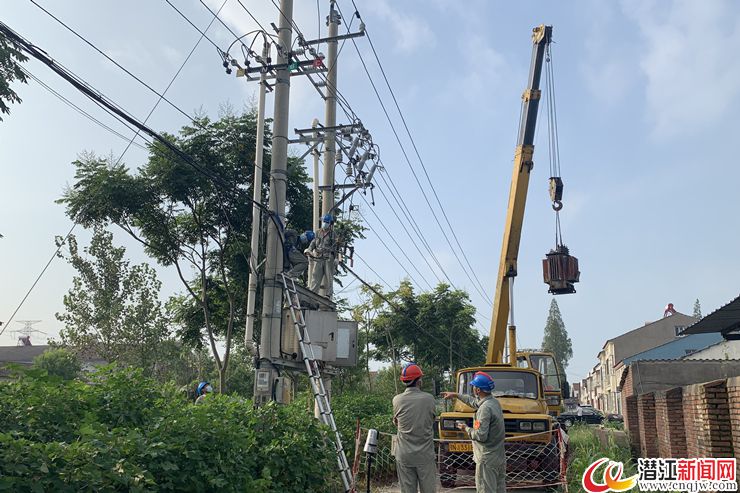 “注意,往右边一点,好,慢慢放下。”8月11日早上8时许,在积玉口镇花亭村,国网潜江供电公司积玉口供电所的4名工作人员、1名吊车司机正紧锣密鼓的开展更换配变作业。