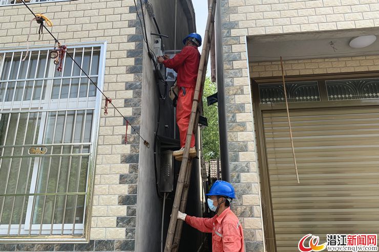 另一边,国网潜江供电公司王场供电所的施工队伍正在王场镇代河村2组进行下户电缆安装作业。