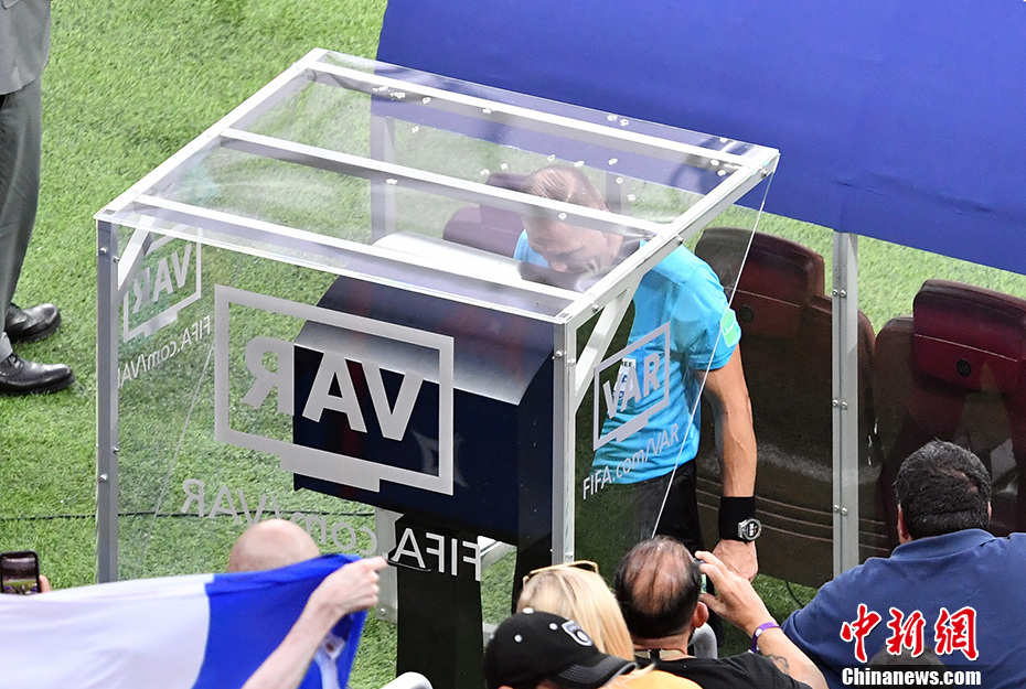 图为2018俄罗斯世界杯决赛,法国队与克罗地亚的比赛中,法国队通过VAR获得一粒点球,格列兹曼主罚命中为球队将比分超出。中新社记者 毛建军 摄