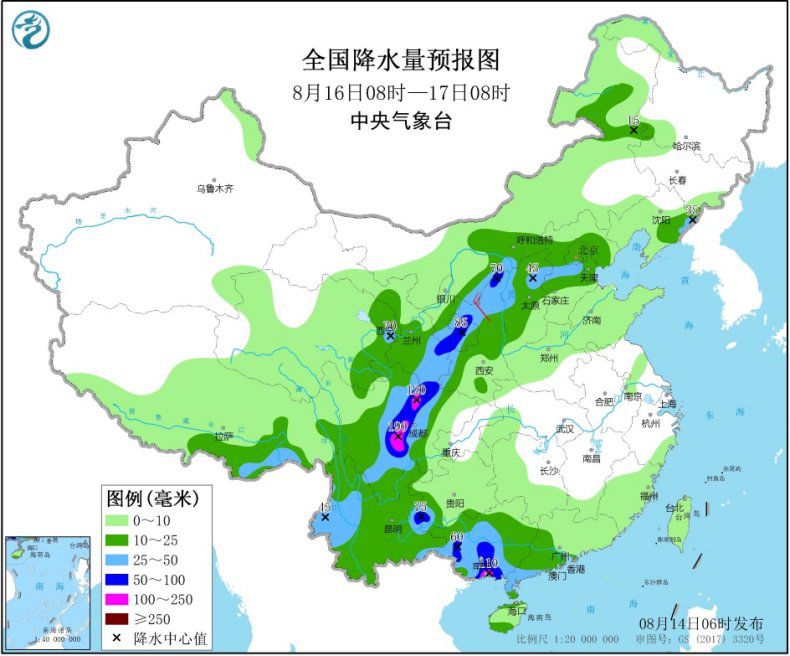 8月16日08时至17日08时,内蒙古中部和东北部、辽宁东部、华北中部和西部、西北地区中东部、西南地区北部和南部、华南中西部、西藏东南部等地的部分地区有中到大雨,其中,陕西北部、甘肃东部和南部、四川盆地西部、云南东部、广西中南部等地有暴雨或大暴雨(100~190毫米)。陕西北部等地有4~5级风。