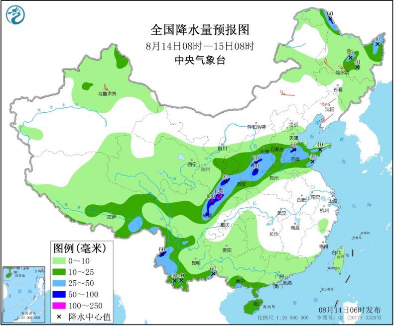 8月14日08时至15日08时,黑龙江北部和中东部、西北地区东部、华北中南部、黄淮东部、西南地区东北部和南部、华南南部、西藏东部等地的部分地区有中到大雨,其中,黑龙江西北部、陕西西南部、山西西南部、山东北部、四川盆地西北部、云南西部等地的部分地区有暴雨或大暴雨(100~130毫米)。内蒙古东部、黑龙江西南部、辽宁中部、新疆沿天山地区等地有4~6级风。