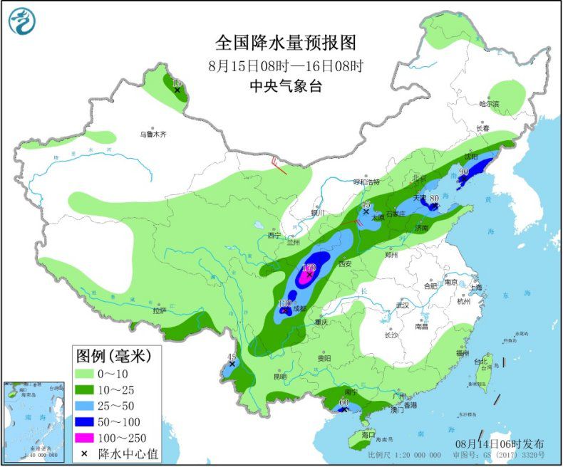 全国降水量预报图(8月14日08时-15日08时)