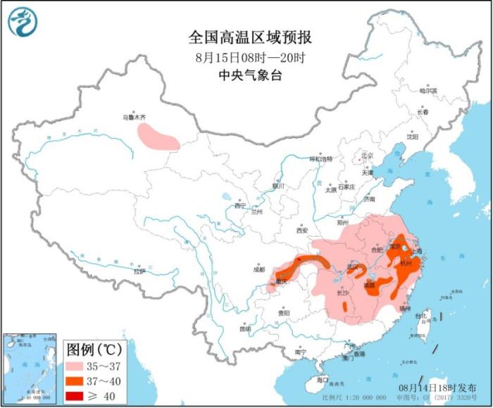 中新网8月14日电 中央气象台8月14日18时发布高温黄色预警:预计8月15日白天,南疆东部、河南南部、安徽、江苏、浙江、上海、重庆、湖北大部、湖南大部、江西、福建西部和北部、广东北部等地有35℃以上高温天气,其中,重庆沿江地区、湖北西部和东南部、安徽东南部、江苏南部、浙江中北部、江西北部、湖南东南部、福建北部等地部分地区最高气温37~39℃,局地最高气温可达40℃以上。