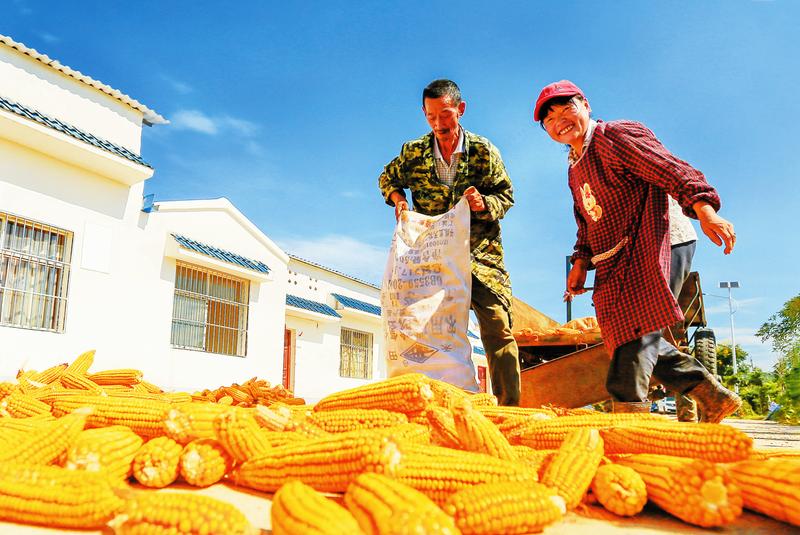 8月14日,曾都区万店镇兴隆村村民金培森和妻子卢昌菊将刚刚收获的玉米倒在自家门前晾晒,他们家今年种有5亩多玉米地,预计可收4000多斤,按今年行情毛利可收入5000元。金培森一家2017年底搬入兴隆村易地搬迁安置点,通过光伏发电、小额贷款入股分红、种植油葵玉米、养猪、养鸡、公益岗位、务工等途径脱贫。(随州日报全媒记者徐斌、特约通讯员张玉国摄)