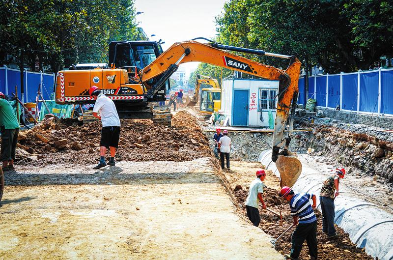 ⑥8月14日,工人顶着烈日在汉东路铺设地下排水管。