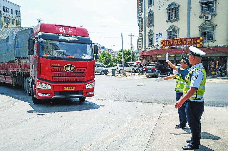 ⑦8月13日,随县殷店镇超检站交警冒着烈日对大货车进行检查。