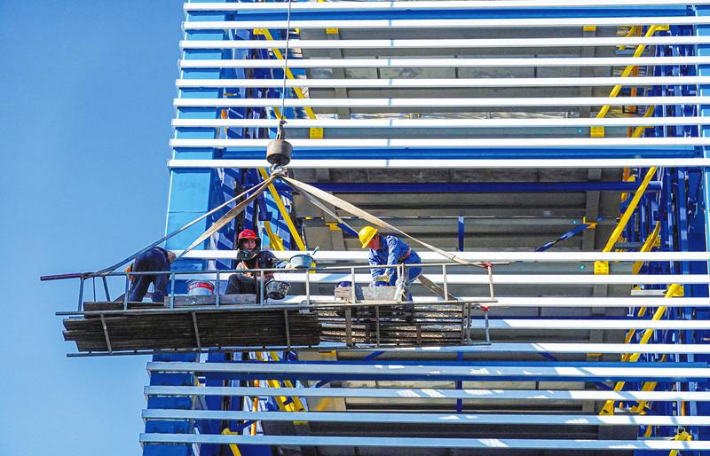 ⑧8月14日,工人正在传媒大厦新建的立体停车场金属围栏上刷油漆。