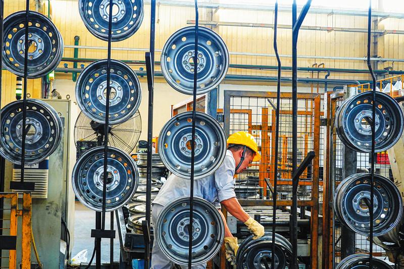 ⑤8月15日,东风随州车轮厂生产线上忙碌的工人。