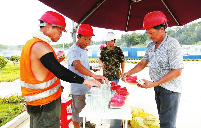 ②碧桂园南山叠翠项目工地,工人们在茶水亭吃西瓜,领取防暑降温用品。