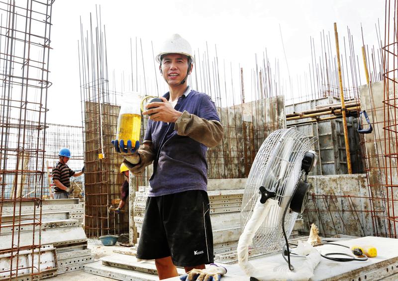 ③碧桂园南山叠翠项目工地,工人在电扇下喝水休息。