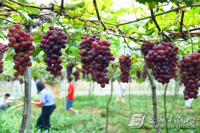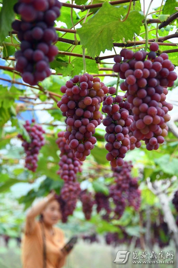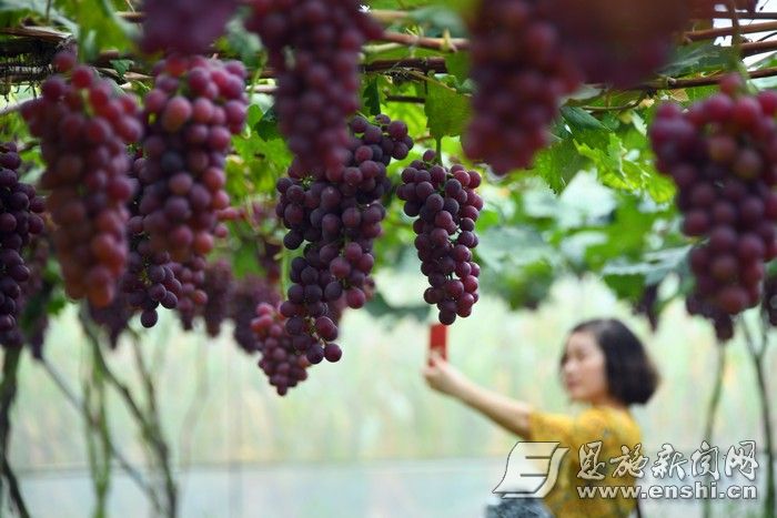 近年来,宣恩县大力发展设施农业,种植葡萄、草莓等设施农业观光采摘园,走出了一条“农业+旅游”的致富路。近日,宣恩县李家河镇秋实葡萄园的葡萄迎来采摘期,游客们前来观光、采摘葡萄,享受田园生活。(通讯员 王俊 摄影报道)