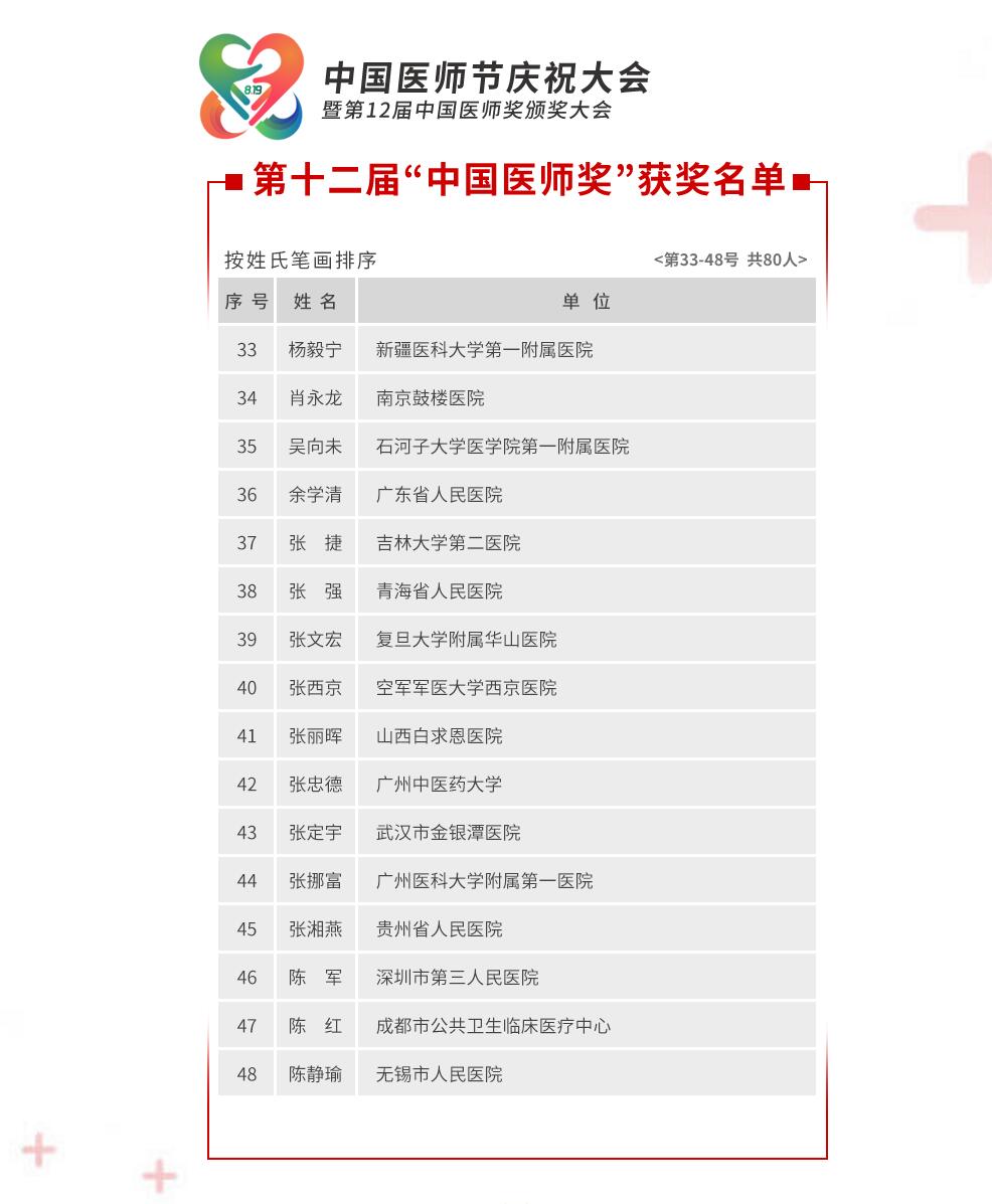 中新网8月19日电 据中国医师协会网站19日消息,第十二届“中国医师奖”获奖名单公布,全国共80位医师入选,其中包括武汉金银潭医院院长张定宇、复旦大学附属华山医院感染科主任张文宏、北京朝阳医院眼科医生陶勇等。