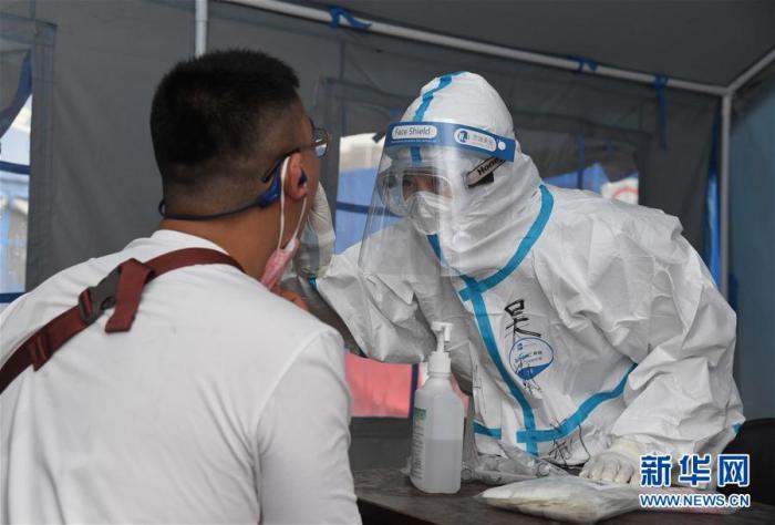 6月18日,在海淀区区级核酸检测采样点,医护人员为市民进行核酸检测采样。新华社记者 任超 摄