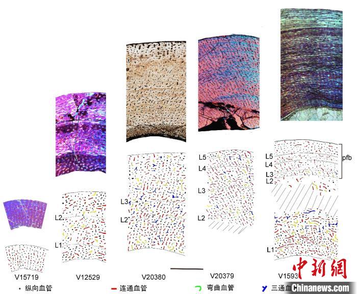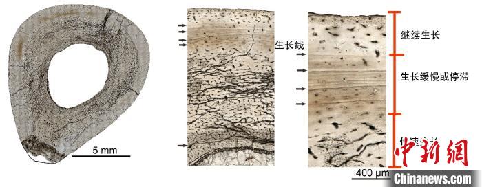 最大热河龙个体IVPP V15939骨组织形态,生长缓慢区域可能由于环境或者行为方式的改变造成的。(研究团队 供图)