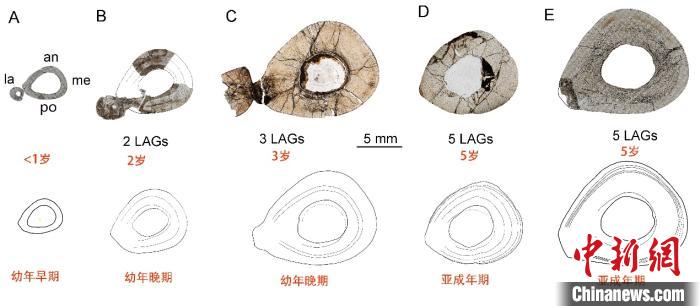 不同个体的骨组织显微结构及素描图,L1-L5指生长停滞线,比例尺1mm。(研究团队 供图)