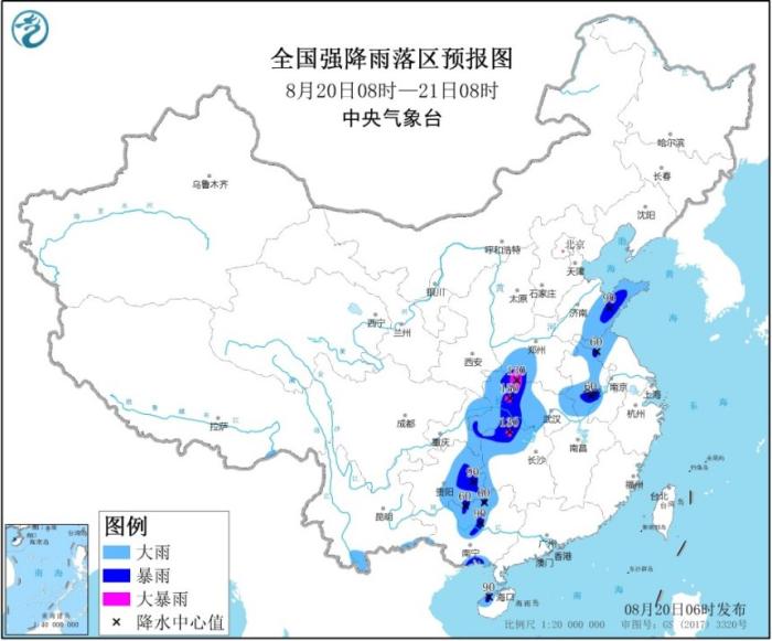 中新网8月20日电 中央气象台8月20日6时继续发布暴雨黄色预警,预计,8月20日8时至21日8时,广西中北部、海南岛、云南南部、贵州中东部、重庆东部、湖南西部和北部、湖北、河南南部、安徽中北部、江苏北部、山东东部和南部等地的部分地区有大到暴雨,其中,湖南北部、湖北北部、河南西南部等地局地有大暴雨(100~150毫米)。