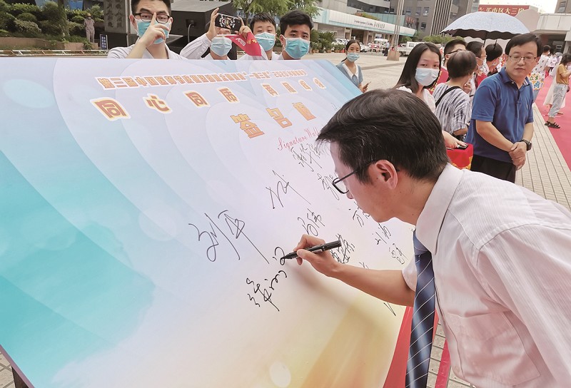 医务工作者在签名墙签名。