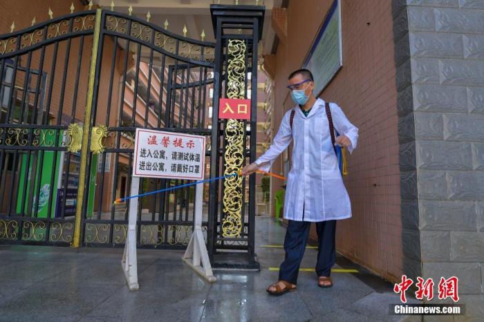 资料图:海口经济学院的工作人员在学生宿舍楼入口消毒。 中新社记者 骆云飞 摄
