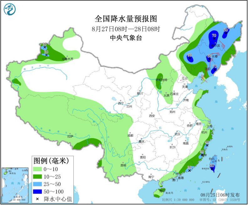全国降水量预报图(8月25日08时-26日08时)