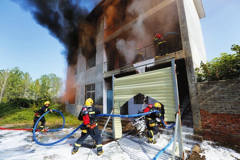 近期,市消防支队针对“四小场所”火灾事故多发开展真火实景演练,提高小型公共休闲场所、住宿场所、娱乐场所、餐饮场所的火灾应急救援能力。图为8月28日,随州消防官兵在曾都区东城办事处一处废弃楼房开展火灾扑救演练。(随州日报全媒记者徐斌、通讯员程奇摄)
