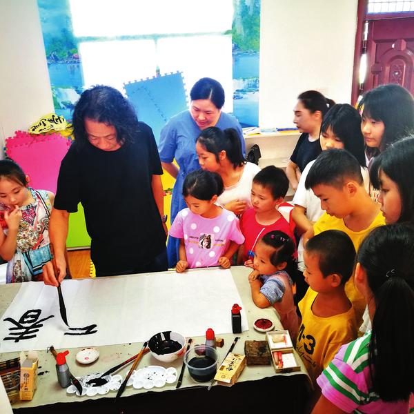 8月29日,曾都区西城飞来土社区组织有音乐、绘画、书法等特长的社区志愿者,来到曾都区何店镇花塆村儿童之家,开展公益联盟活动,让孩子们在活动中聆听乐章、绘制童画、观摩书法,开拓视野,陶冶情操。 (随州日报全媒记者黄闯、通讯员张蕾摄)