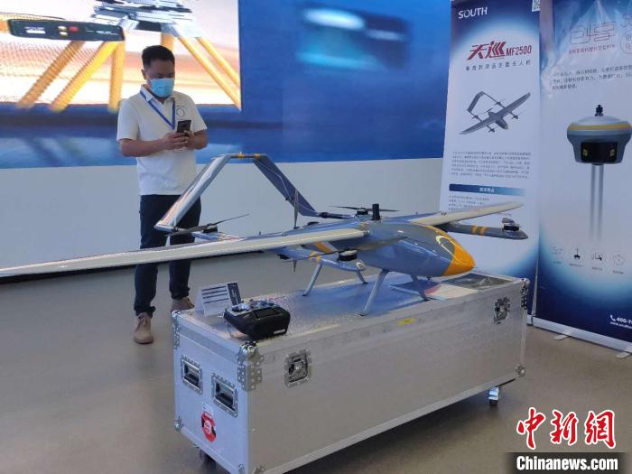 “集智高新区 北斗系中原”系列主题活动由北斗产业发展高端论坛、首届北斗产业成果展等方面内容组成。在首届北斗产业成果展上,与会展商展出天巡MF2500垂直起降固定翼无人机。 郭超凯 摄