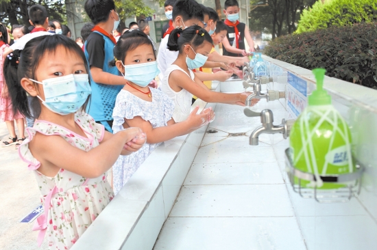 8月31日,荆州市灵均中学(原荆州区太晖小学)迎来秋季开学第一天,小朋友们自觉净手消毒。(记者李波涛 通讯员王丽萍摄)