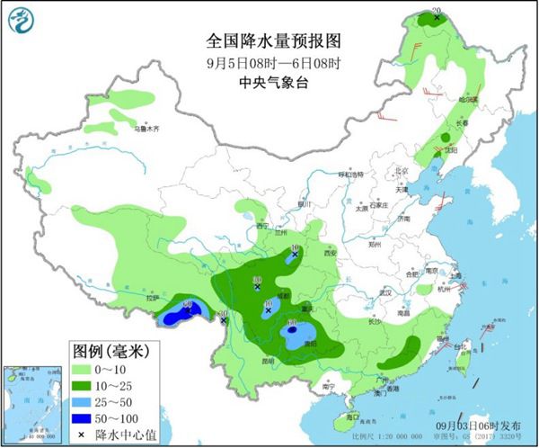 9月5日,黑龙江西北部、甘肃南部、四川中西部、贵州大部等地部分地区有中到大雨,局地有暴雨。