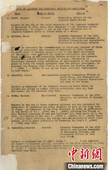 日本重要战犯罪行表。民盟上海市委会供图