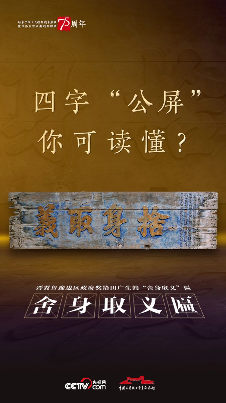 央视网消息:2020年9月3日,我们迎来纪念中国人民抗日战争胜利暨世界反法西斯战争胜利75周年。忆往昔,那是一段不可忘却的历史;展未来,那将是一段永不会被尘封的记忆。它刻在漫漫历史长卷中,它刻在每一个中国人的心里。在中国人民抗日战争纪念馆中,它还有着更具象的表达,更细节的“呼吸”。铭记历史,是为了启迪未来。值此周年纪念之际,央视网和中国人民抗日战争纪念馆联合出品12张抗战文物纪念海报,让那些峥嵘岁月里的“微表情”带你走近实现中华民族伟大复兴中国梦的初心。(策划/张莉,设计/刘京京,鸣谢 中国人民抗日战争纪念馆)