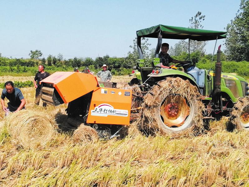 9月3日,市农机局与奇骏农机公司联合在曾都区北郊余家老湾村开展农机新机具演示示范,演示给农民看,带着农民干,促进农机新机具推广与应用,使农机更好地服务于农业生产。图为打捆机正在演示打捆作业。(随州日报通讯员孙友汉摄)