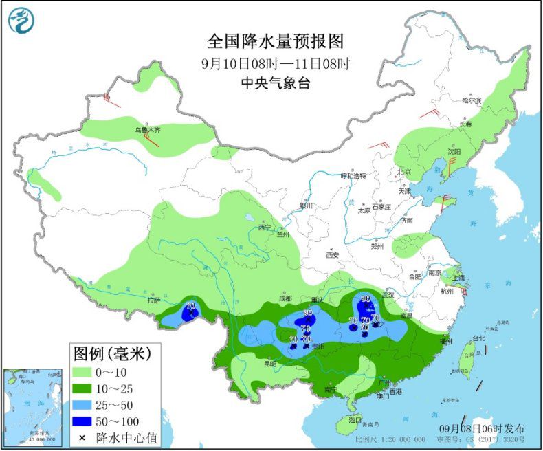 9月10日,江南西部和南部、西南地区中南部、华南大部等地部分地区有中到大雨,其中,湖北南部、湖南中北部、四川盆地南部、贵州西部等地局地有暴雨。
