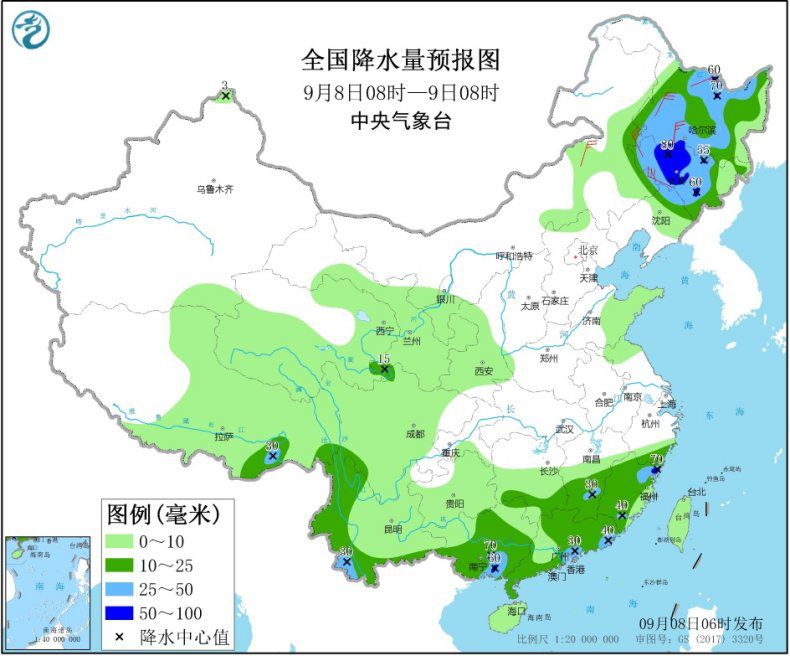 9月9日,黑龙江东部、吉林中东部、江南西部和南部、西南地区东部和南部、华南北部和中部等地部分地区有中到大雨,其中,四川盆地南部、云南东北部等地局地有暴雨。