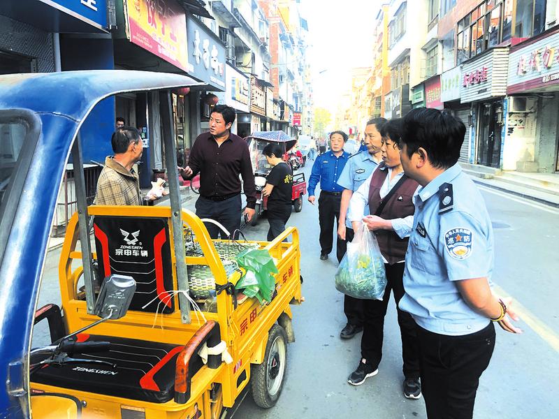 曾都区西城办事处双龙寺社区加强辖区背街小巷环境秩序整治,保持干净整洁有序,助力文明城市建设。图为巡逻专班对随意卖菜的小贩进行劝导。(随州日报通讯员冷红娟摄)