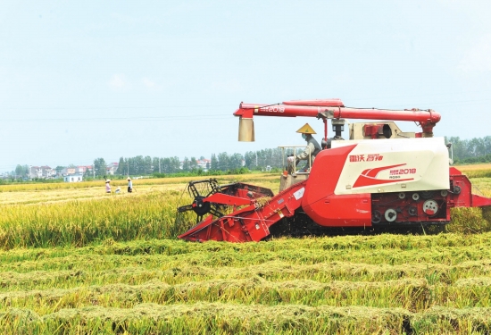 11日,监利市汪桥镇欣阳村5组农民忙着收割稻谷。该村以种植水稻为主,有耕地面积7931亩,今年经过精细管理,田间稻谷长势良好,呈现出一片丰收景象。(梅闻摄)